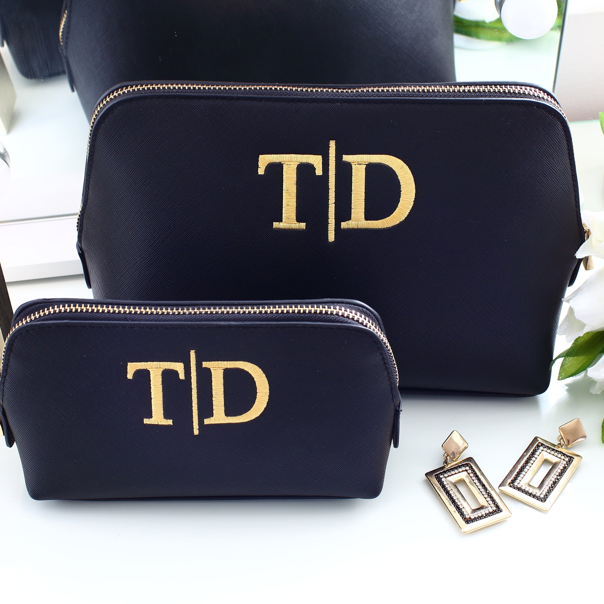 Our stunning embroidered cosmetic bags are luxurious and exude sophistication and style.  Available in two practical sizes to house all your makeup and toiletry essentials whether you're home or away.