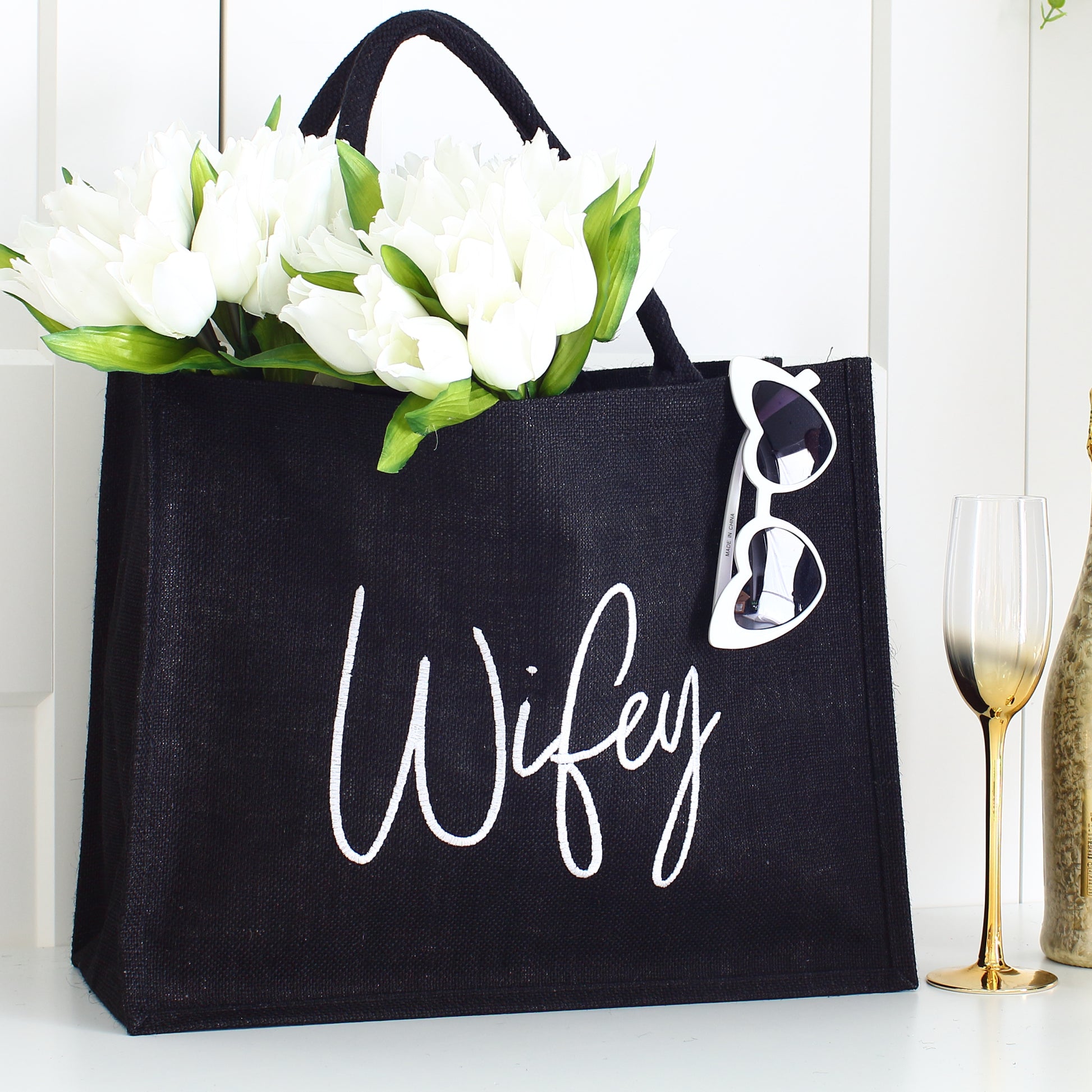 A strong and practical tote bag if you're the Bride to be, Just Married, celebrating an anniversary or just because. Made from eco-friendly jute and large enough to hold day to day essentials such as shopping or for the beach.