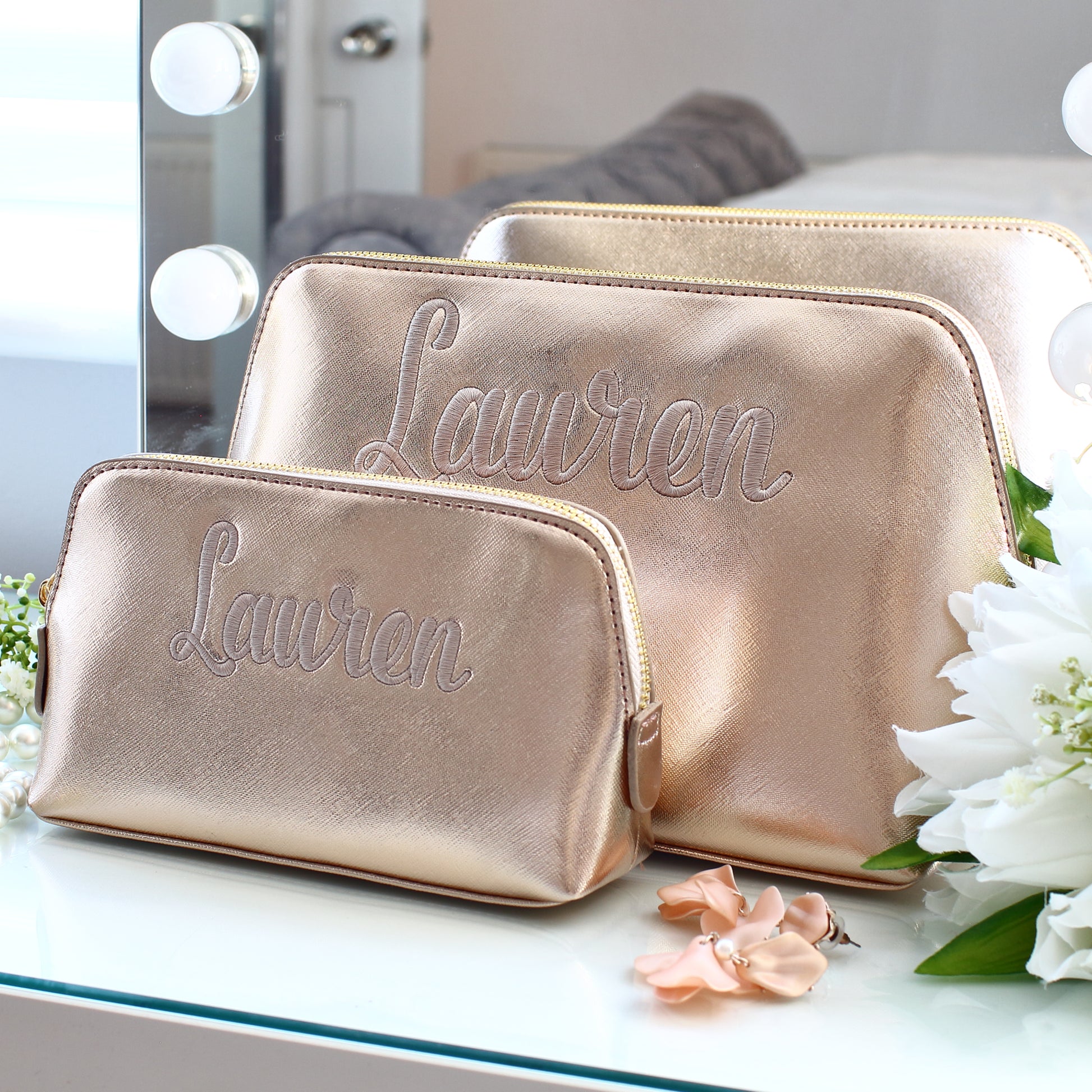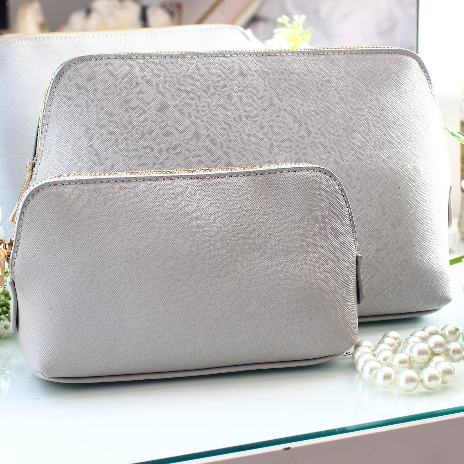 Please note our grey makeup bags have a slight variation between the large and the medium size as shown in the last photo. Please do not purchase if this will be an issue as we don't refund on personalised orders.