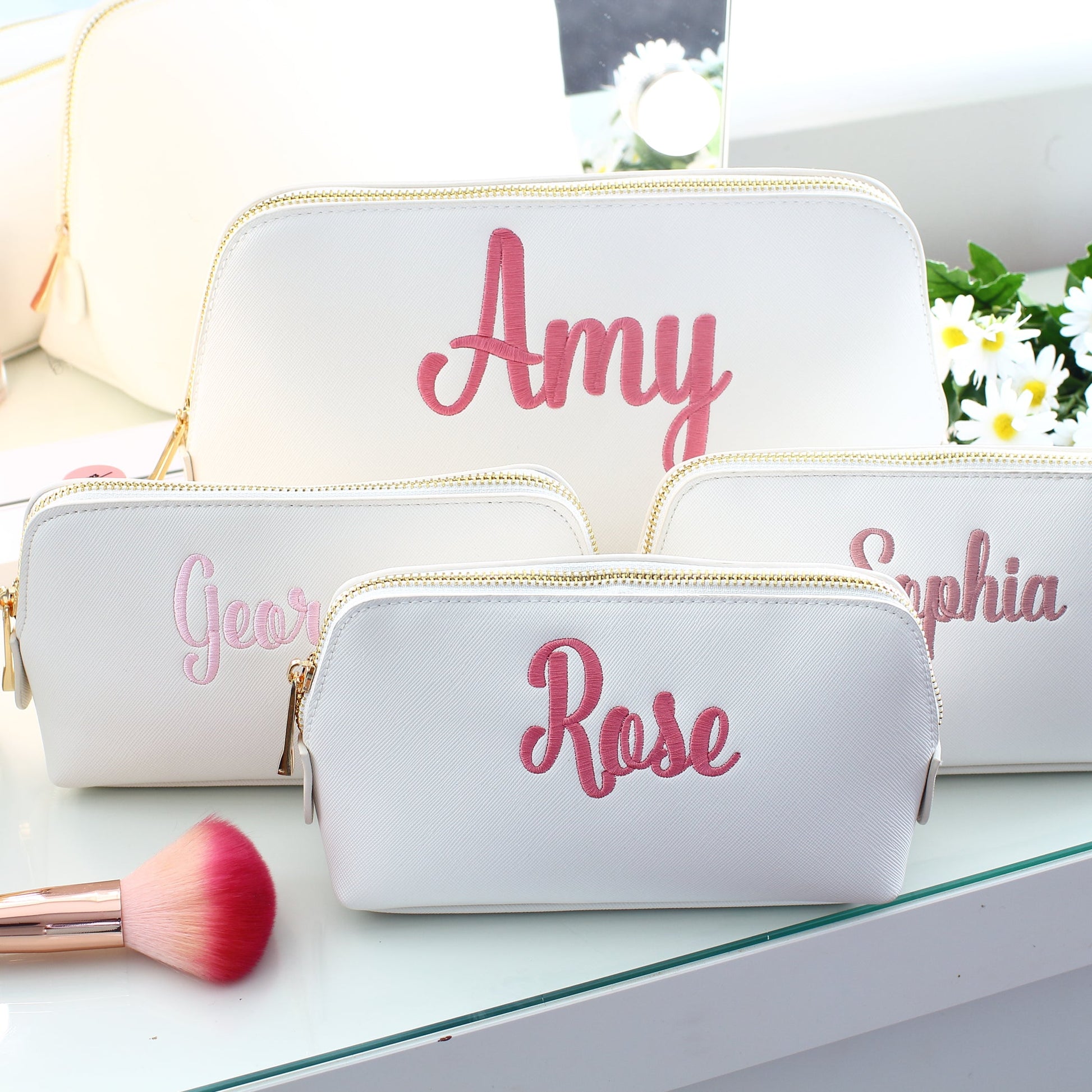 *Soft white makeup bags - Rose pink thread