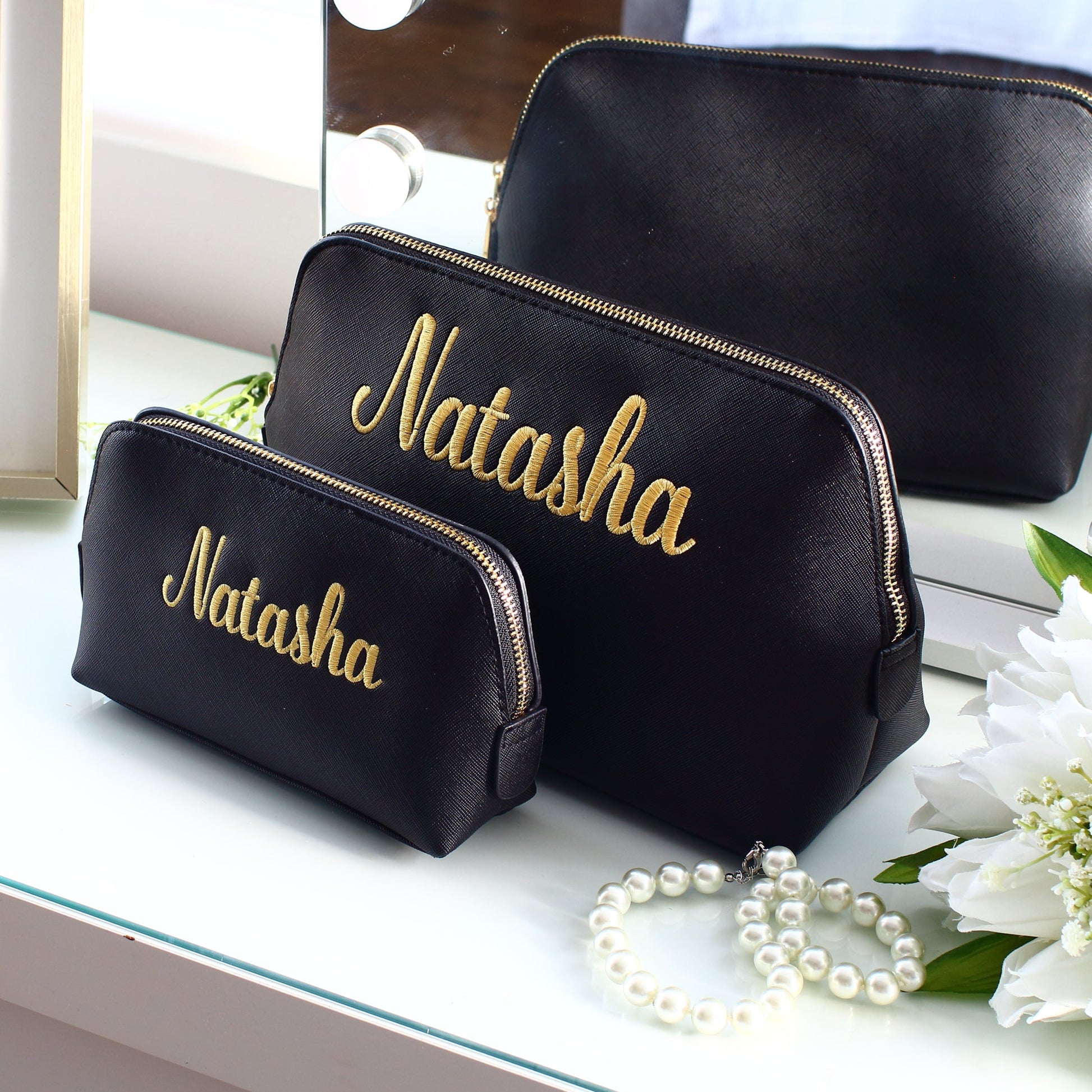 Please note our grey makeup bags have a slight variation between the large and the medium size as shown in the last photo. Please do not purchase if this will be an issue as we don't refund on personalised orders.