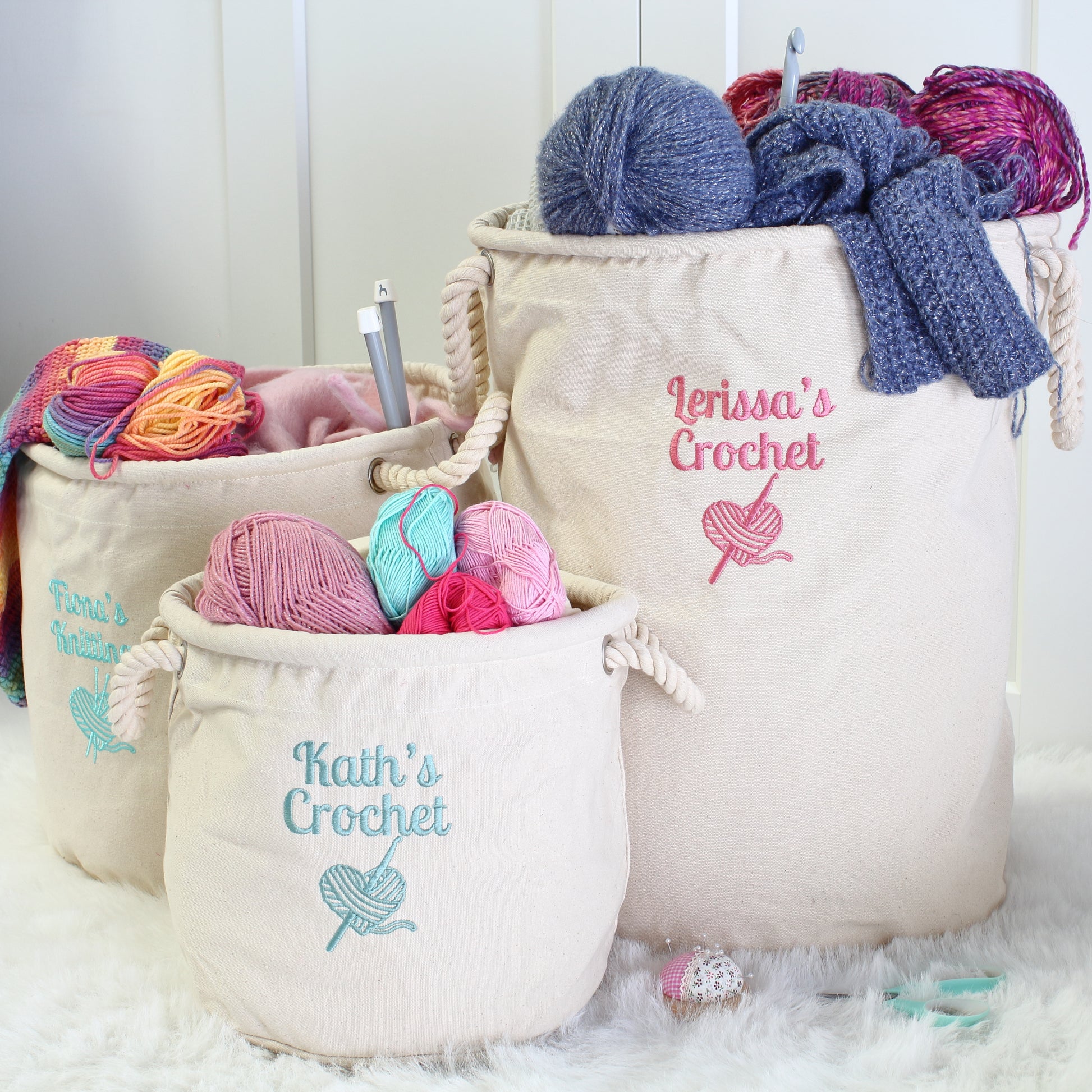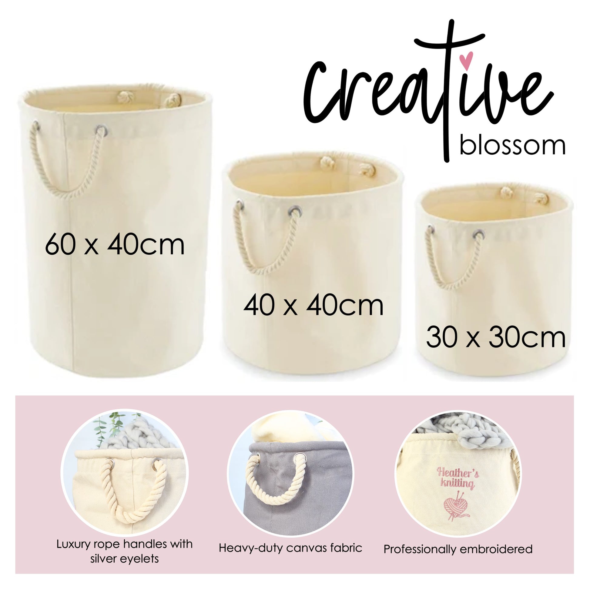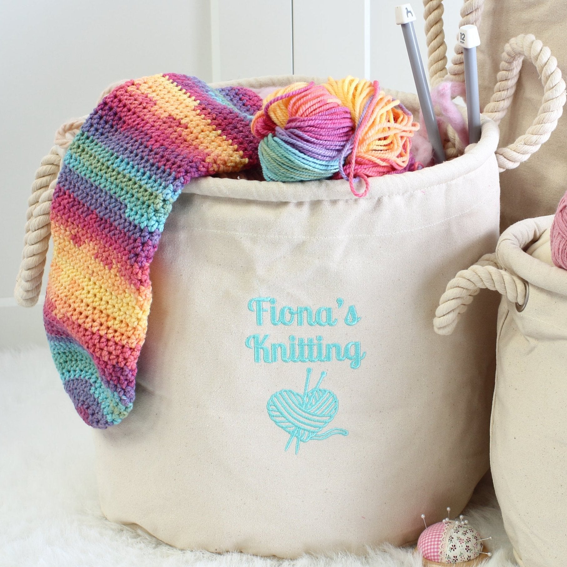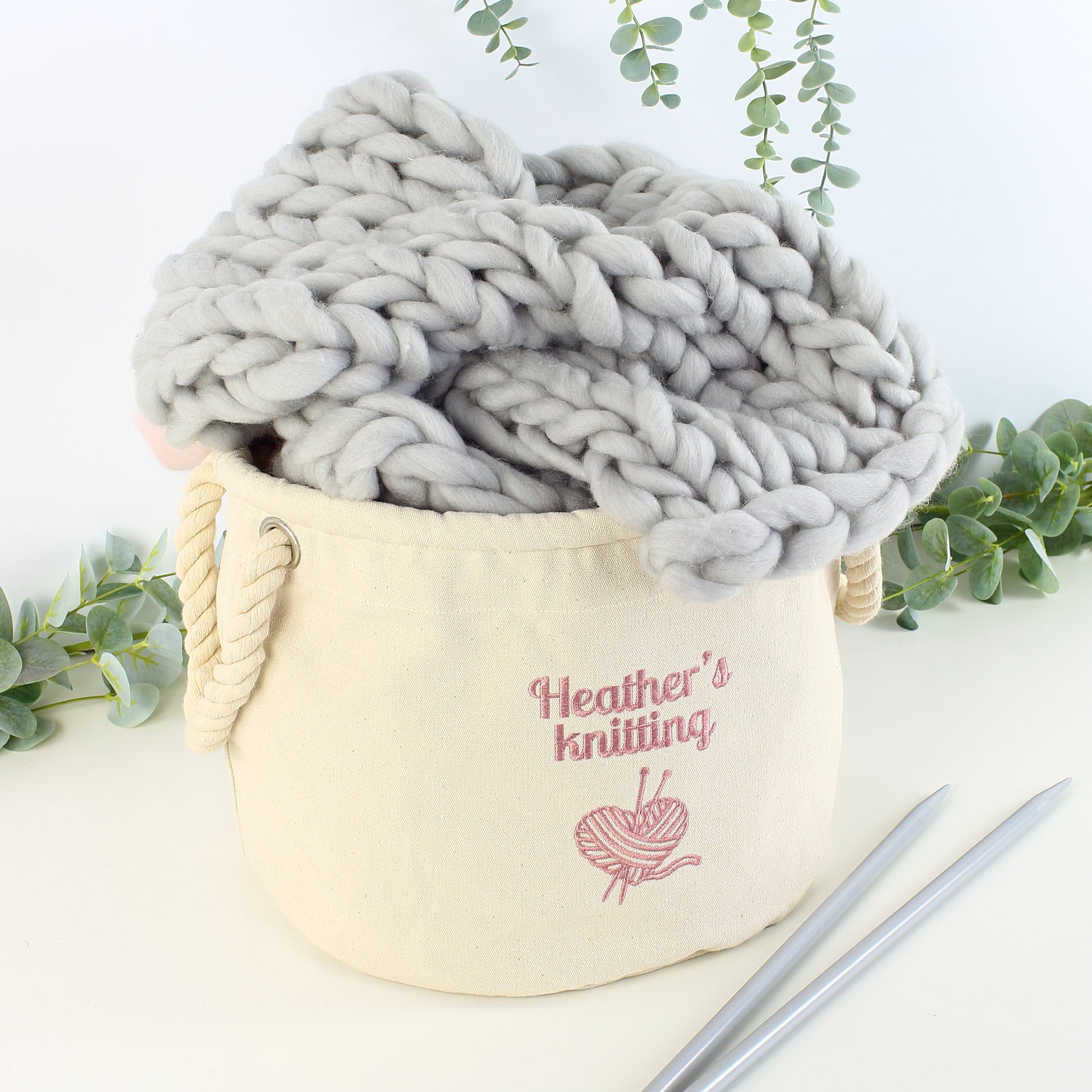 This beautiful heavy-duty canvas storage basket is professionally embroidered with a name and then 'Knitting' with a gorgeous embroidered heart designed to mimic a ball of wool. A beautiful gift for knitting lovers.